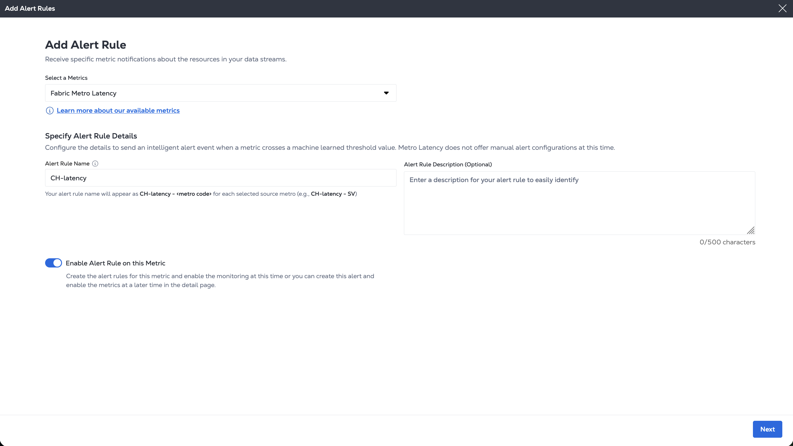 For Streams where you have attached Metros, you can create smart alerts for latency thresholds. These AI-powered alerts analyze historical latency data across your metro locations using machine learning to establish baseline performance and generate smart alert thresholds, eliminating the need for manual alert configuration.