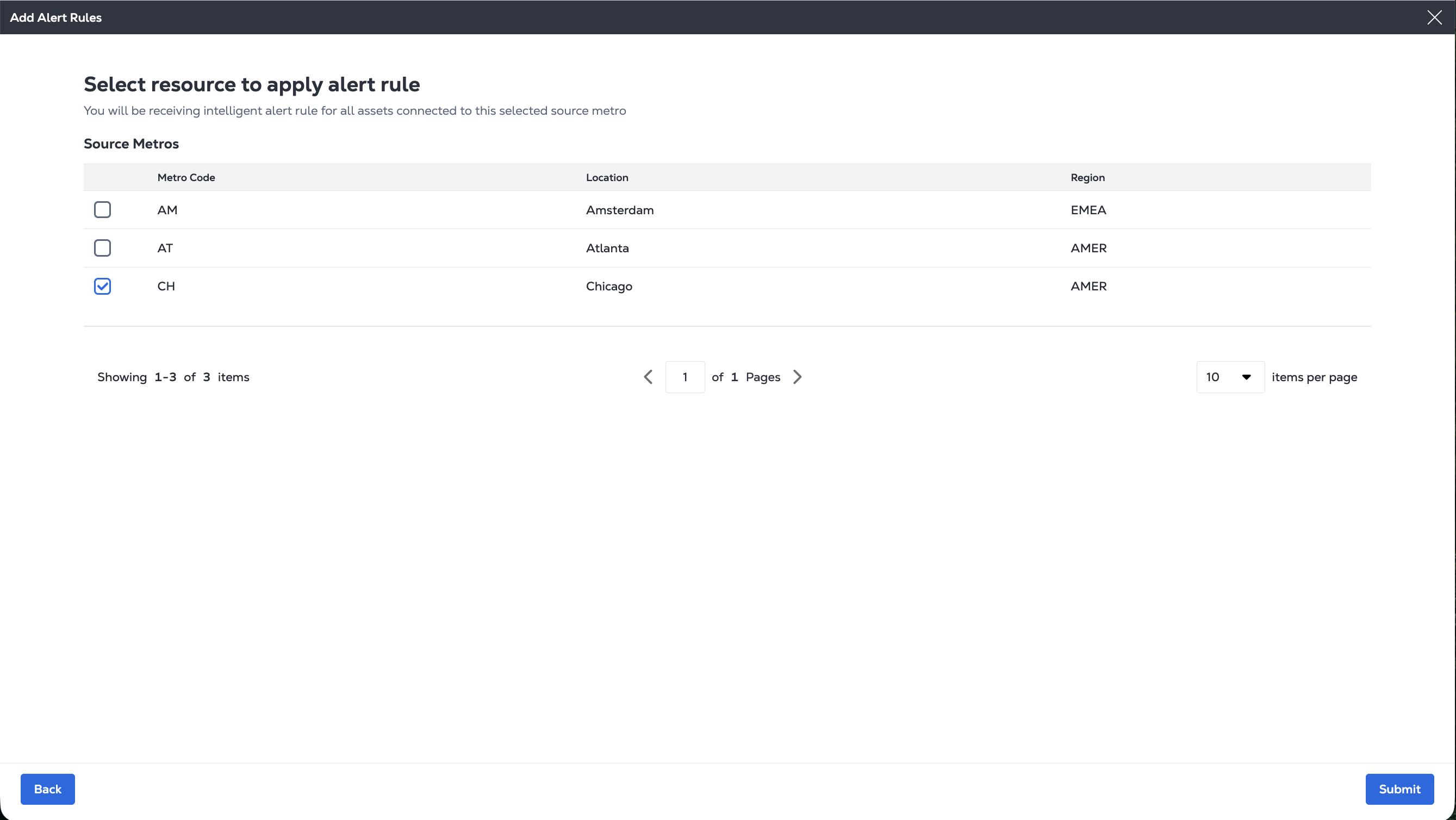 Select a Metro or Metros to apply a smart alert rule to.