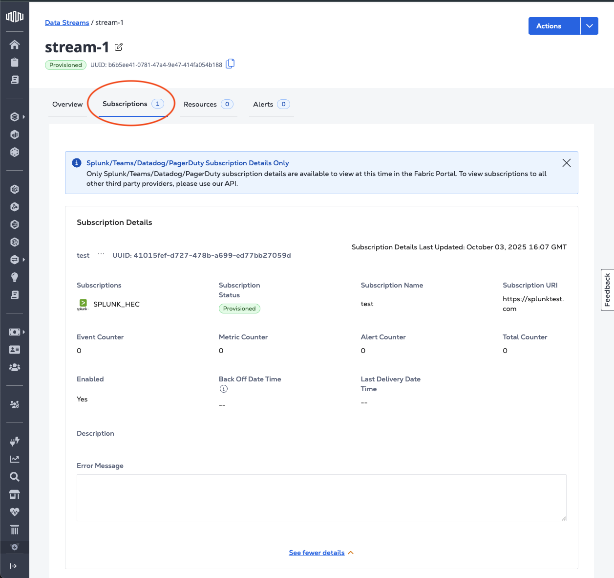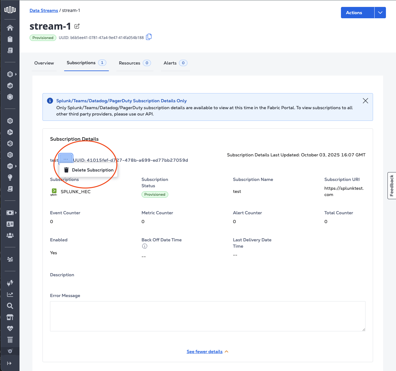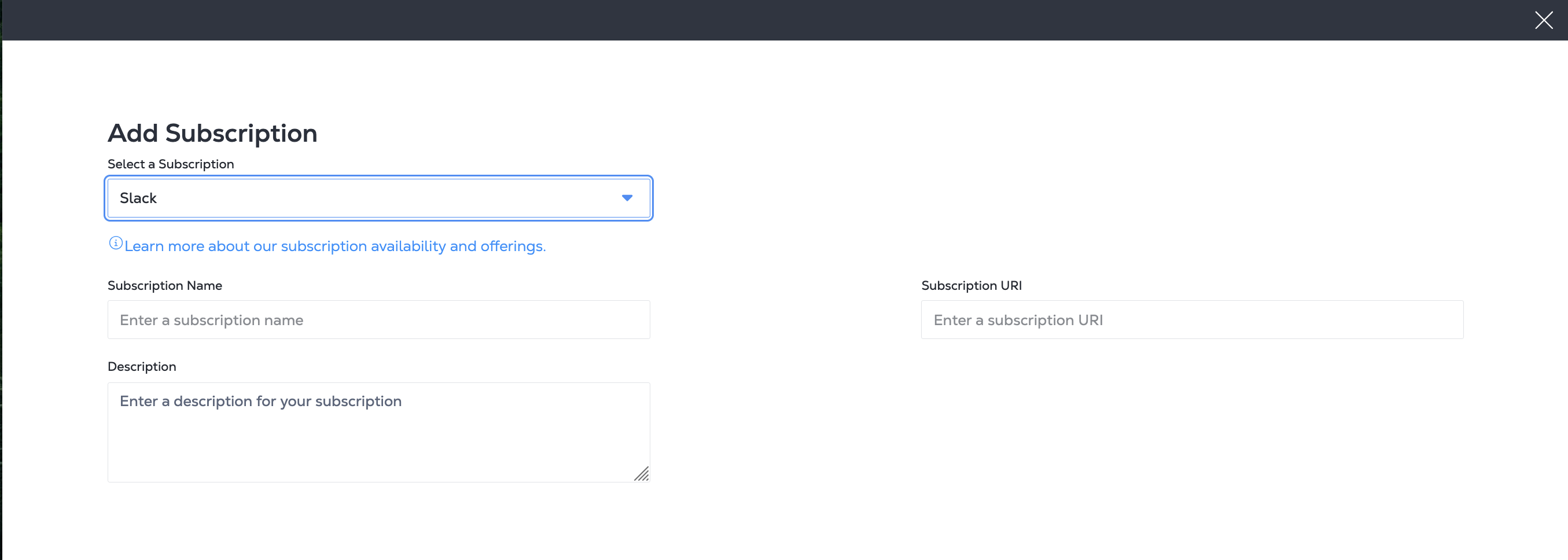 The portal supports creating and managing subscriptions to Splunk, Datadog, Microsoft Teams, and PagerDuty.