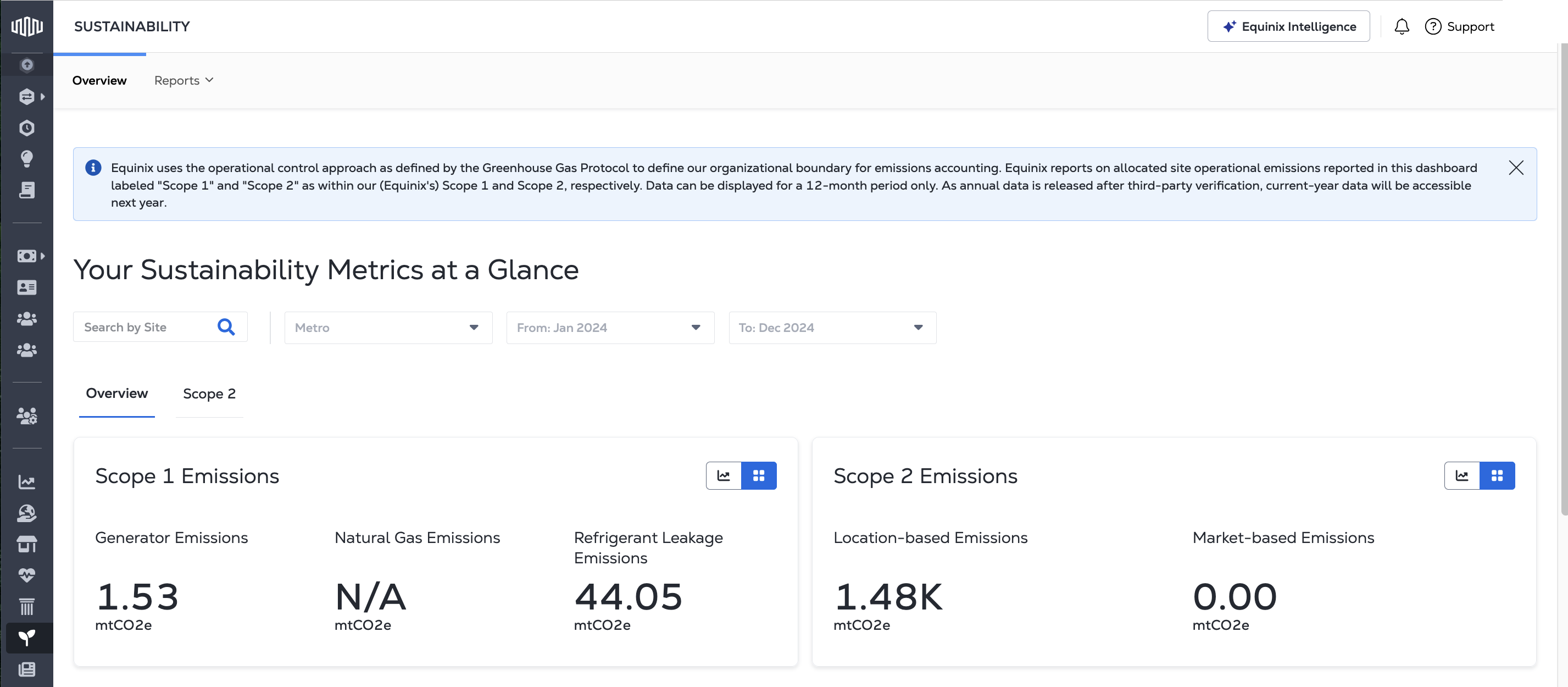 Scope 2 Dashboard provides monthly and annual your Equinix Scope 2 emissions data. Including:
