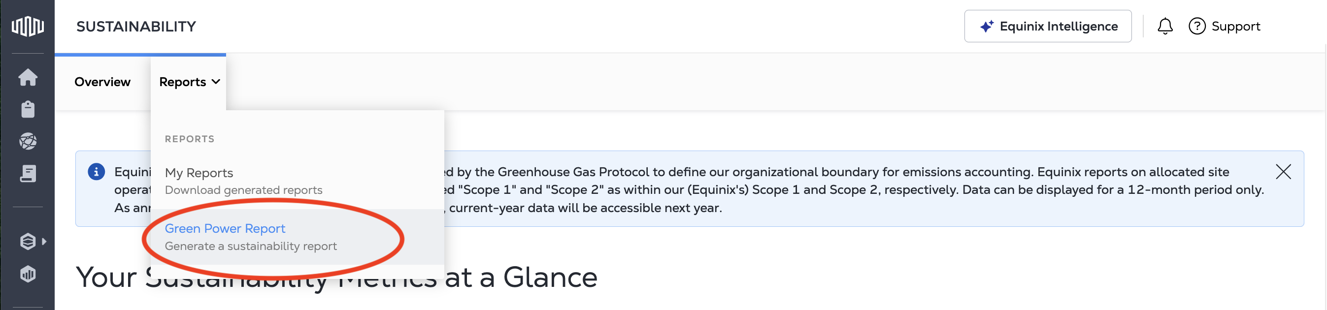 The Sustainability Tool in the Equinix Customer Portal provides sustainability data dashboards and the ability to generate sustainability data reports. In order to access your data in the Portal, you need Sustainability Report permissions for each of your eligible IBX locations.