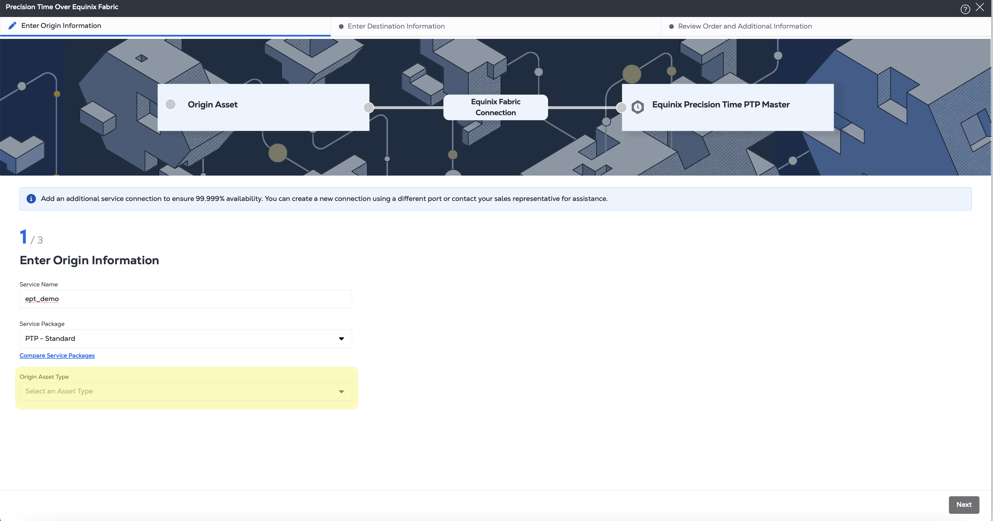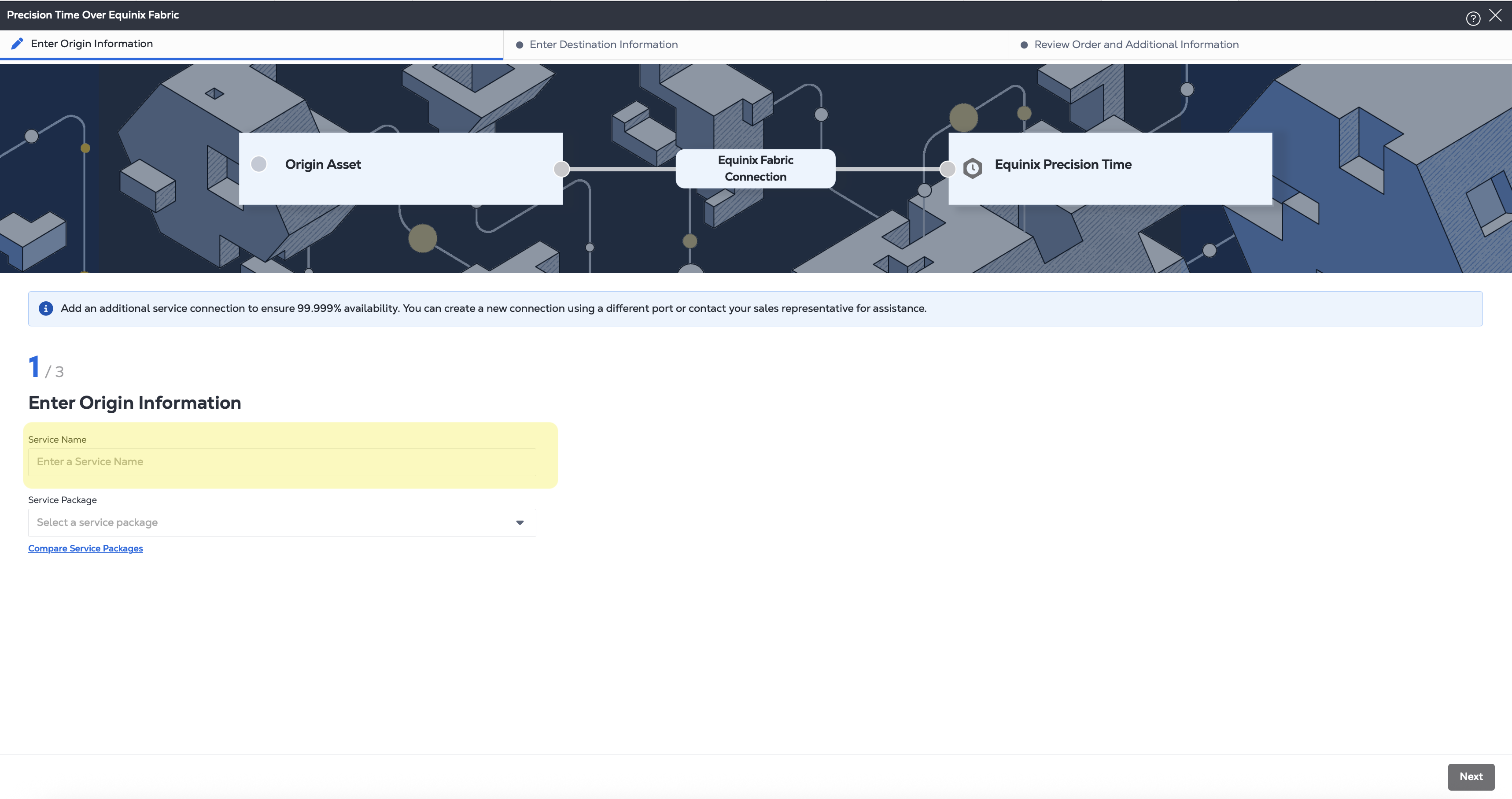 You can now set up and provision your Equinix Precision Time services using Connect on the Customer portal. This enables you to use your existing Fabric account to create and manage Equinix connections. You can create new Precision Time connections through this single portal login.