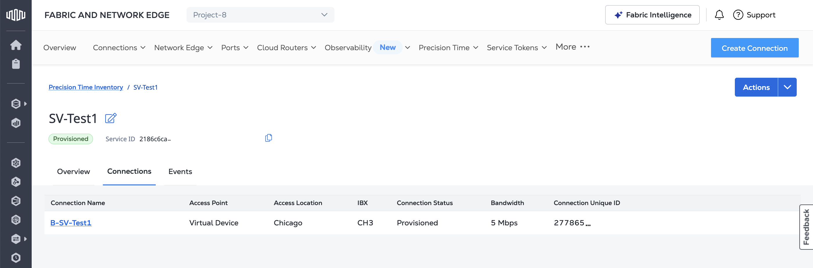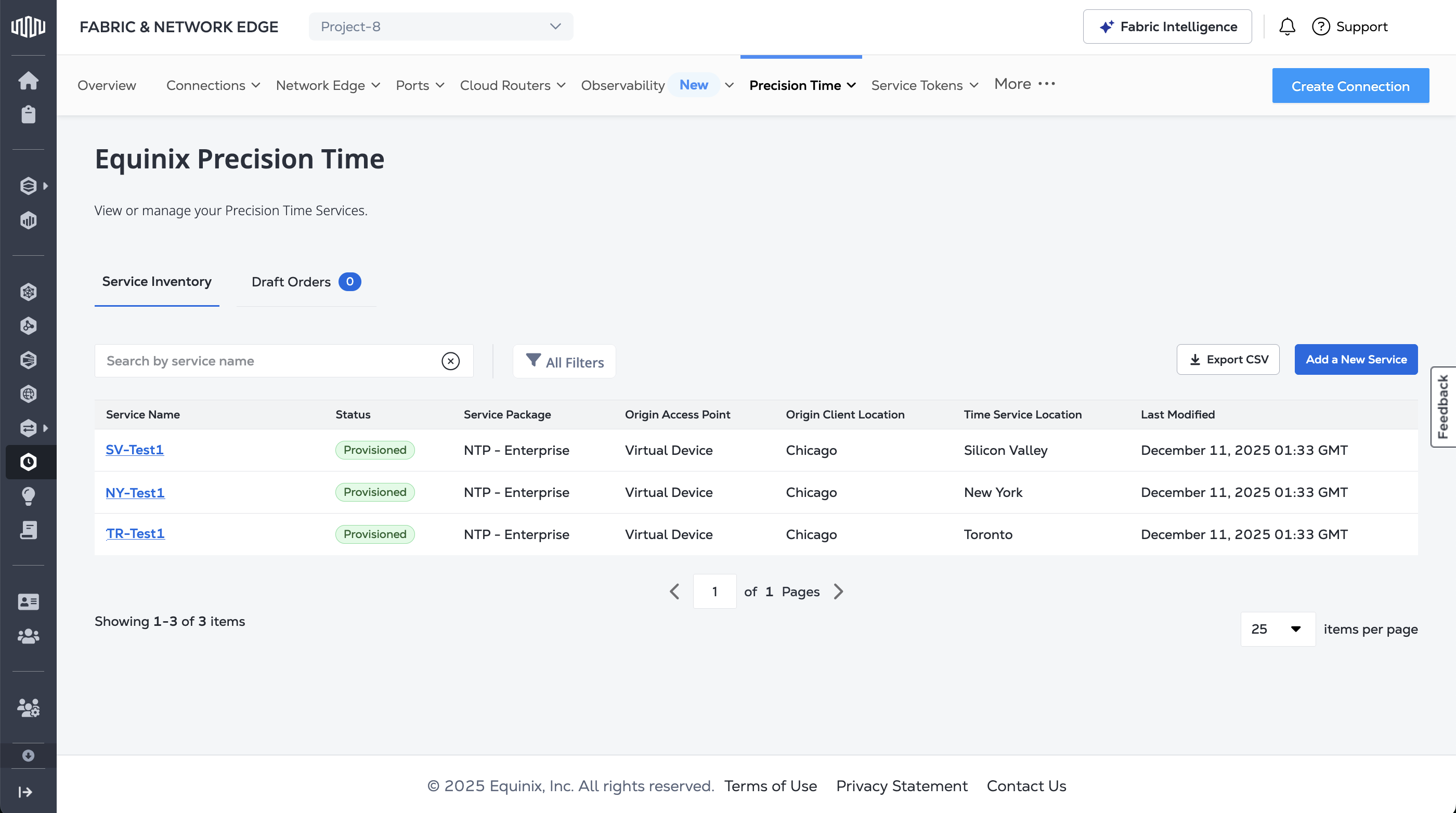 The Precision Time Inventory lists all the Precision Time service instances that are included in a billing account, along with their provisioning status. If your Fabric account has been transitioned to the Equinix Identity and Access Management (IAM) platform, use the Context Switcher drop-down list to access your project and its assets.