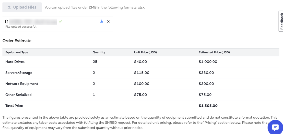 Real-time order pricing estimates are available directly within the SHRED order form. These estimates are automatically calculated based on the quantity of equipment entered and the corresponding disposal category unit price.